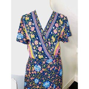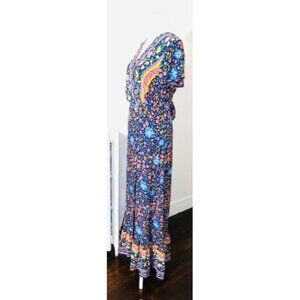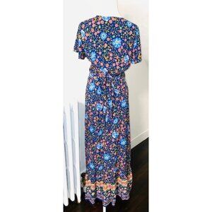 Boho Floral Maxi Dress Small V Neck Short Sleeve Wrap Tie Waist Ruffle Hem