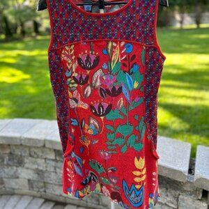 dress, mini dress, tank dress, sleeveless, red, crimson, scarlet, blue, navy, green, olive, purple, magenta, yellow, gold, black, floral, flowers, botanical, abstract, geometric, knit, woven, soft, stretchy, A-line, fitted, casual, everyday wear, spring, summer, bohemian, boho, artistic, vintage-inspired, colorful, vibrant