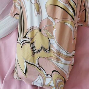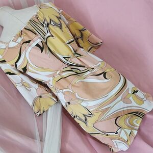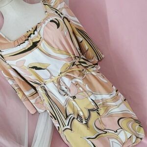 Pre-owned clean good condition 'Rady' Japan Import mini dress with ribbon tie detail at the waist and Rady logo swirl print in orange, peach, gold. Rady is a brand featured in the gyaru magazine Koakuma Ageha.