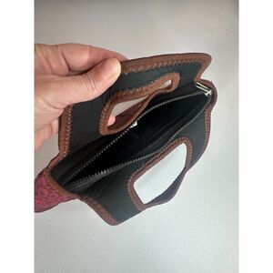 Lightweight, soft neoprene clutch with a retro floral print—perfect boho vibes and great for fall. Chocolate-brown base with magenta, purple, mustard and orange blooms. Cut-out top handles for an easy grab, plus a center zip closure with two slip sections for quick access. Compact yet roomy enough for phone, wallet and keys—ideal for festivals, errands or a night out.