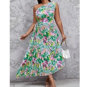 Boho Floral Print Cut out Pleated One Shoulder Maxi Dress