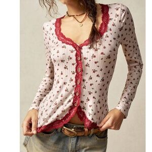 Boho Floral Print Lace Trim Ribbed Button Down Fitted Top