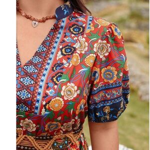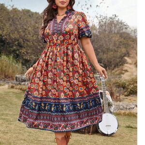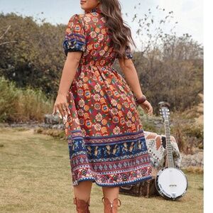 Boho Floral Print Notched Neck Puff Sleeve Dress