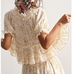 Boho Floral Print Notched Tie Neck Ruffle Hem Blouse