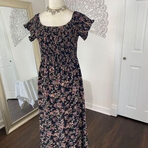Boho Floral Print Off Shoulder Shirred Slit Thigh Midi Maxi Dress L