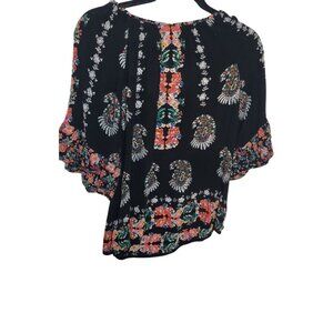 Boho Floral Print Peasant Blouse By Bila M Black Short Sleeves Ruffle Hem Lightw