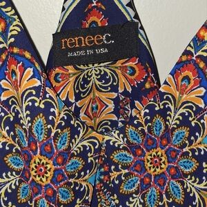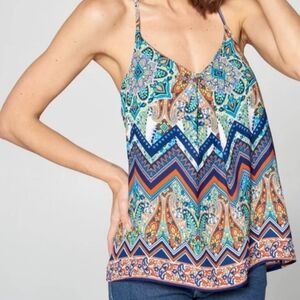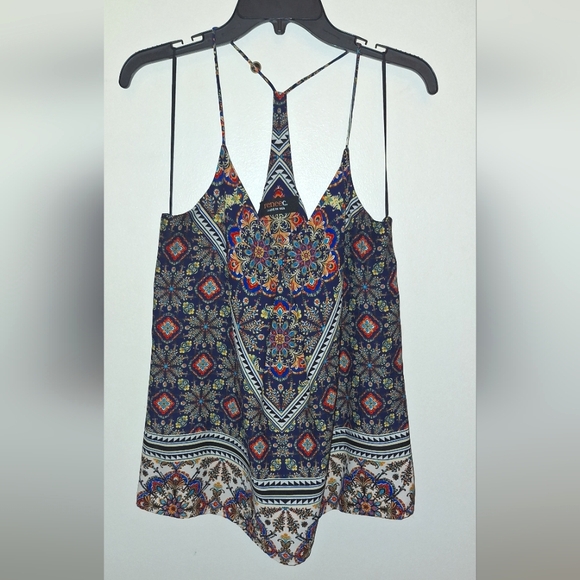 Breezy lightweight floral tank features multi color flowers on a Navy background.
