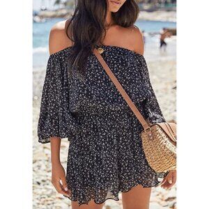 Have them wondering about all you with this gorgeous romper one-piece! Featuring a dreamy floral printed chiffon with dainty ruffle details and drawstring waistband to cinch in your waistline. Flirty off shoulder construction and ruffled short sleeves. Relaxed, loose fit. Flowy shorts. Leave them raving about you with this charming ruffled romper playsuit. ❤️