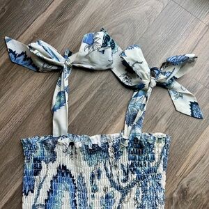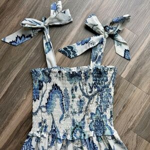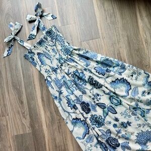Boho Floral Print Smocked Maxi Dress with Tie Straps Blue White Size S
