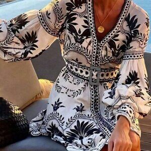 Boho Floral Print V neck Balloon Sleeve Mini Dress