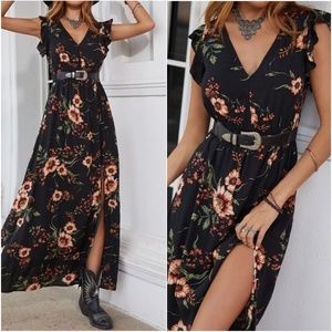 Boho Floral Print V neck Ruffle Cap Sleeve Maxi Dress