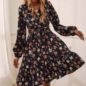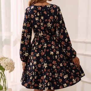 Boho Floral Print belted long sleeve Ruffle hem Mini Dress