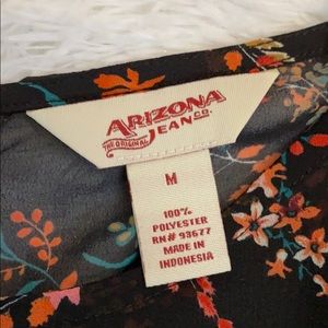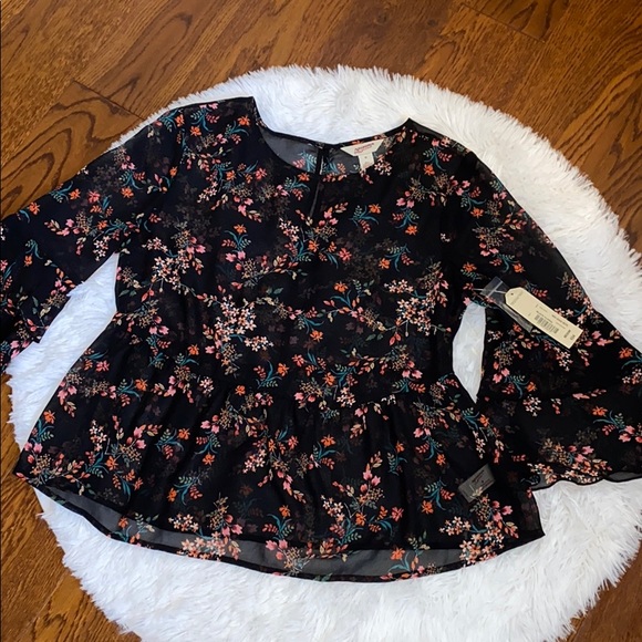 Super cute floral top with ruffle on bottom and bell sleeves. Black background with flowers in orange, pink, green, tan. Lightweight material and semi-sheer.