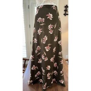 Boho Floral Satin Maxi Skirt Army Green Pink Orchid Print 2 Side Slits Women’s S