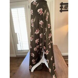Sadie & Sage Boho Floral Satin Maxi Skirt Army Green Pink Orchid Print Side Slit Womens S