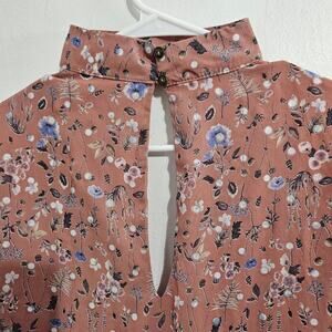 Boho Floral V-Neck/Choker Neck Womens Pink Flowy Top Bell Sleeve. Size Small. Fully lined. Keyhole back with buttons. Excellent condition. Cottagecore. 100% polyester. Not stretchy.