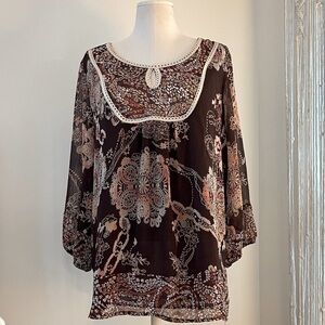 Beautiful Bohemian, print, pink, brown cream, and white with gold specs throughout. Lace detail at neckline. Looks new. Lightweight, fully lined. Very summery. So cute!