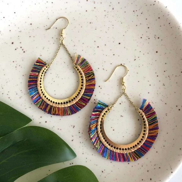 NWT handmade dangling boho gold hoop earring with colorful fringe. Lightweight.