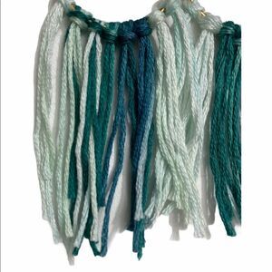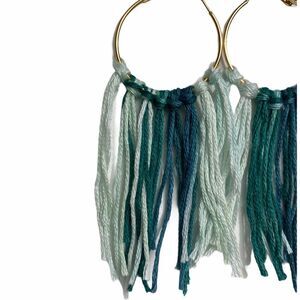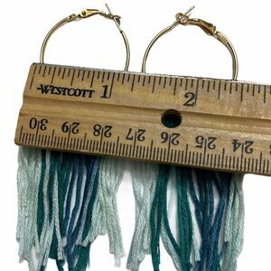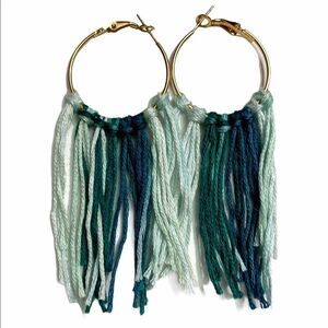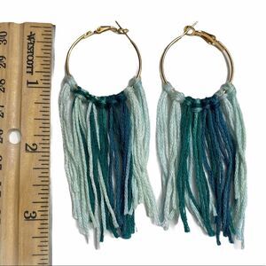 Features: gold tone hoops, tassels, blues and greens, clasp closure, medium hoop earrings, bohemian