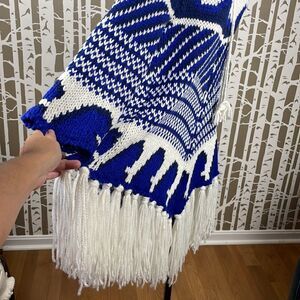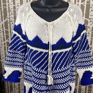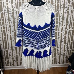 Piperlime Collection Boho Fringed Trim Sweater Mini Dress / Tunic sz XS. Features thick and soft acrylic knit in cream, cobalt & navy blue wave/geometric pattern, long fringe trim, 3/4 length sleeves, tassel trimmed neck tie accent, drop V hemline. Gently worn and laundered with one very small hole at the back of the neck where one piece of the yarn is broken (see pic). If you love unique pieces - don't miss out on this great sweater - so fun with leggings and knee high boots! Great for a festival!
