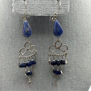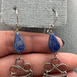 Boho Genuine Blue Stone Long Dangle Tassel Earrings Silver Tone Layered Knotted