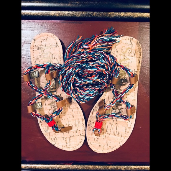 These Bold Boho Style Twist Fabric Tie gladiator sandals are sooo cute! Multi color fabric ties can be wrapped in different ways up the ankle depending on the look you want! Trendy flat cork heel sandal with fun contrasting ties make these some of my faves!