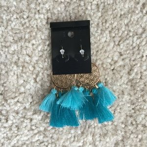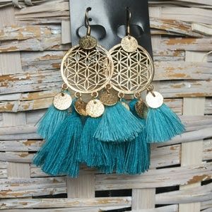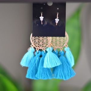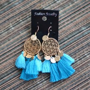 Dangling boho earrings 14k gold plated, french wire drop backs, gold-plated discs, cotton tassels. Earrings are 3.6 inches long. Gold, turquoise/teal, and sky blue, bohemian dreamcatcher ombre fringed earrings.