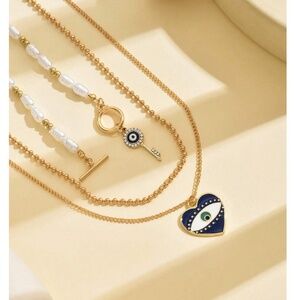 Boho Gold Tone Evil Eye Heart Faux Pearl Multichain Necklace