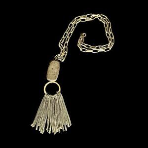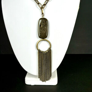 * Pendant is a brown stone with black flecks finished with a metal circle with metal tassel/fringe