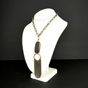 Boho Gold Tone Fringe Tassel Pendant Necklace Oval Speckled Stone Western Artsy