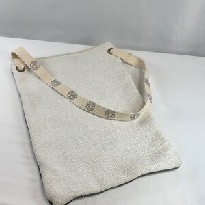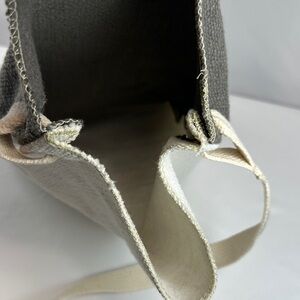 Boho gray & cream tote bag with a textured design. Features a cream strap with logo details.