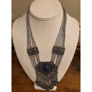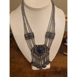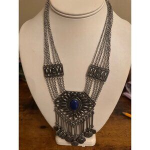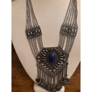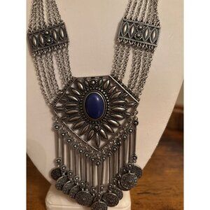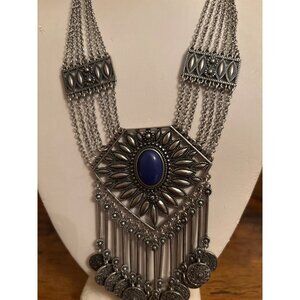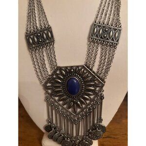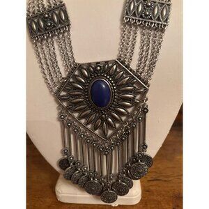 Boho Gypsy Coin Bib Necklace Bold Silver Statement With Blue Stone