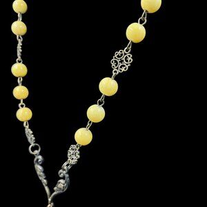 Add a unique statement to your boho wardrobe with this handcrafted long pendant necklace featuring soft yellow marbled beads, intricate bronze filigree connectors, and a turquoise howlite cross focal charm. Finished with a silky gold tassel drop, this piece perfectly blends vintage vibes with Southwest flair. Lightweight and versatile, it layers beautifully with both casual and dressy outfits.