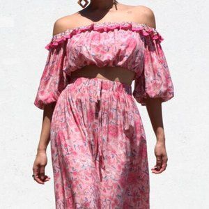 Beautiful Pink Floral Bohemian Gypsy 2 Pc Crop Top and Maxi Skirt Set Outfit