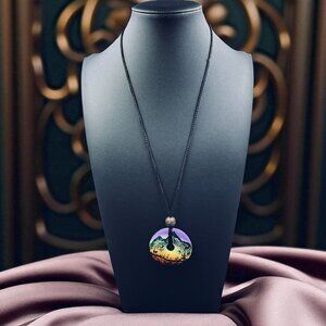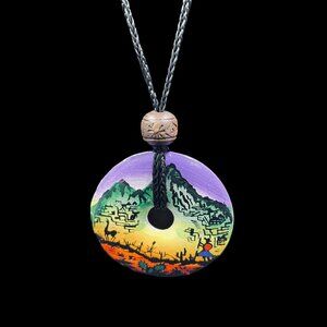 Stand out with this unique, handcrafted boho-style necklace featuring a circular donut pendant with a hand-painted desert mountain landscape in vibrant ombré hues. The pendant hangs on an adjustable black braided cord with a wooden bead detail, perfect for casual wear, festivals, or gifting. This tribal-style necklace is lightweight and makes a bold artistic statement with its Southwest-inspired motifs and vivid sunset palette.