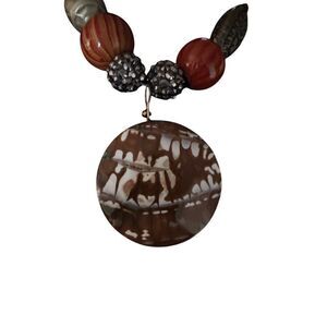 This handcrafted necklace combines a variety of multicolored beads with a bold brown and white statement pendant, offering a unique, artistic design.