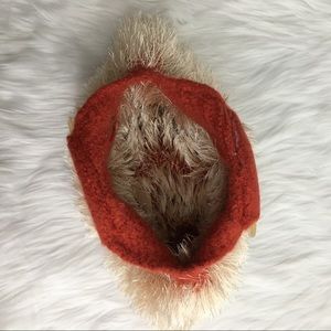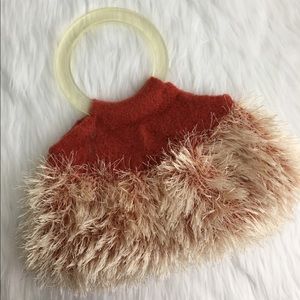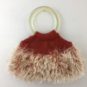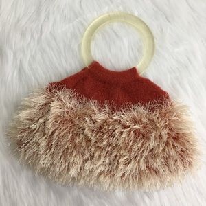 Artisan made flexible handcrafted auburn felted wool slouchy bag. Has a double clear round handle. Made of 100% wool. Accent cream eyelash yarn is nylon/polyester. To care for this bag hand wash in cool water & lay flat to dry or dry clean. Measurements flat are approximately 8” tall x 13” widest point. Handles have a 4 1/8” opening. In excellent new condition. NWT