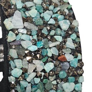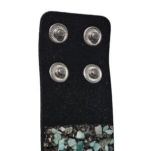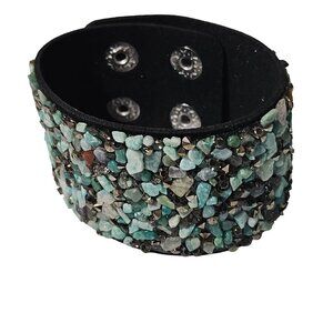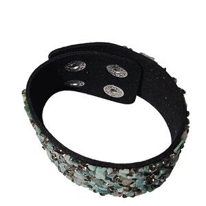 This stylish bracelet features a wide leather band adorned with gemstone chips. Secure snap closure ensures an elegant fit for any wrist.