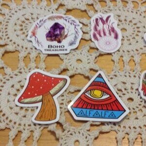 12 new inspiring and fun stickers for crafts, scrapbooking, cellphone, locker, computer, water bottles such as hydroflask. Boho, hippie vibe. Love, cute sloth, boho treasures, etc. These are small stickers, around 1 1/2" diameter. Might make fun stocking stuffers or party favor loot bag gifts. nevasdeals