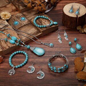 Features: Gorgeous boho set includes 2 turquoise necklaces, 5 pairs of dangle earrings, 2 stretch bracelets, and a layered bangle. Mix and match for a custom vibe or wear as a stunning set. Lightweight and comfortable for all-day wear, with reliable alloy craftsmanship that resists fading and breaking.