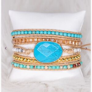 Long, thin tan vegan leather strand that wraps around wrist multiple times. In addition, a large turquoise stone charm with with natural stones/beads and bronze sunflower closure.