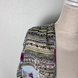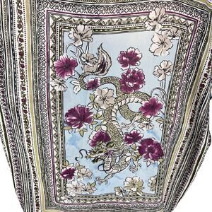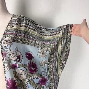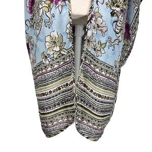 Beautiful boho kimono cardigan in women’s size 1X. Lightweight and sheer with a vibrant dragon and floral print in purple, green, and blue tones. Open front and flowy drape make it a versatile piece — layer over everyday outfits, style for festivals, or wear as a chic beach cover-up.