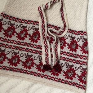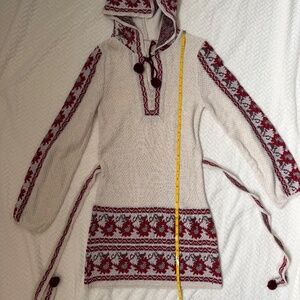 Soft cream knit with red traditional detailing, hood with ties, and matching belt included to cinch the waist.