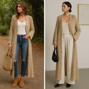 Boho Knit Maxi Cardigan Women’s Beige Duster Sweater L Festival Layering Chic