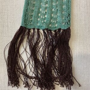 Add a pop of color and texture to any outfit with this gorgeous boho-style knit scarf. Featuring a vibrant mix of teal, chocolate brown, blush pink, and soft peach, this lightweight open-weave design is perfect for year-round layering. Long, flowing fringe adds movement and a relaxed, artisan feel.