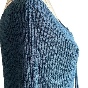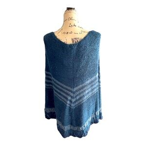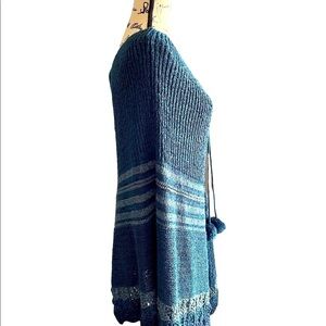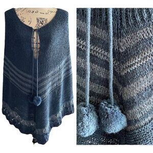 Boho knit poncho shawl in blue and light blue with pom-pom front ties and a handkerchief hem. New with tags. Soft, lightweight, and perfect for layering in fall, winter, or cool summer nights.