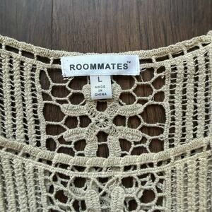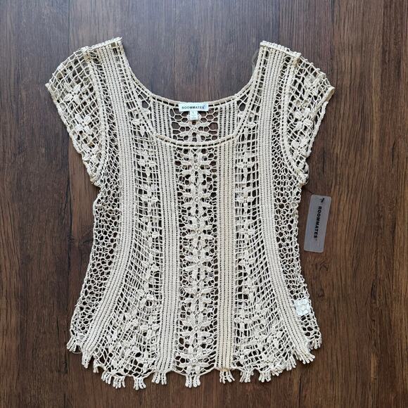Beautiful Roommates crochet top in 100% cotton with an intricate open-knit floral design. Lightweight, breathable, and perfect for layering over camis, swimwear, or bralettes. Features scalloped hemline, cap sleeves, and a flattering feminine shape. Label says Large but runs small, so please check measurements. NWT (new with tags).