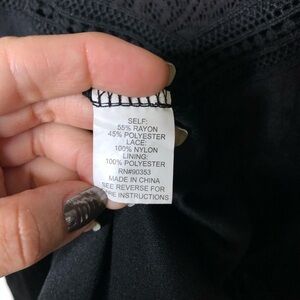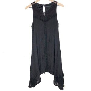 Black sleeveless dress, sharkbite hemline. Sheer lace neckline, lace detail on front and at hem.