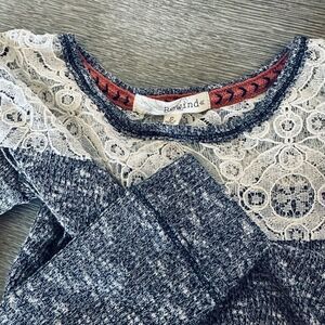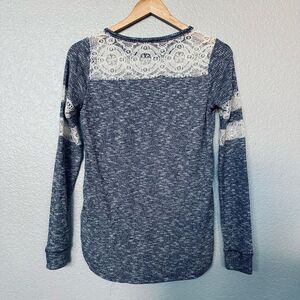 Women’s or junior’s size Small Rewind long sleeve navy blue textured stretchy long sleeve top with cream lace detail. Excellent like new condition, clean nonsmoking home. Approx 17” pit to pit across bust, 12” pit to lower hem side length, 19” pit to wrist sleeve length.