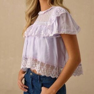Boho Lace Ruffled Butterfly Sleeve Loose Fit Short Sleeve Blouse